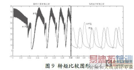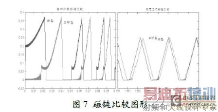 图7 所示是磁链比较图形。从仿真曲线中可以看出,基于半桥型功率变换电路的驱动系统中绕组开关导通时相磁链增大,无论启动阶段还是稳定运行阶段,磁链增大时都有较小幅度的波动,这不利于电机转子的平稳运转;而基于新型功率变换电路的驱动系统克服了这一缺点,开关导通时磁链平稳增加。