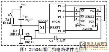来自供电系统以及通过导线传输、电磁耦合等产生的电磁干扰信号,是单片机系统工作不稳定的重要因素,在系统硬件设计时必须采取有效的干扰抑制措施。单片机应用系统中还常使用系统监视电路检测系统发生的错误或故障,自动报警或使系统自动恢复正常工作状态。如采用电源故障监视、看门狗定时器等采用89C51单片机和X25045组成的看门狗电路,X25045硬件连接图如图所示。X25045芯片内包含有一个看门狗定时器,可通过软件预置系统的监控时间。在看门狗定时器预置的时间内若没有总线活动,则X25045将从RESET输出一个高电平信号,经过微分电路C2、R3输出一个正脉冲,使CPU复位。如图1所示电路中,CPU的复位信号共有3个:上电复位(C1、R2),人工复位(S、R1、R2)和Watchdog复位(C2、R3),通过或门综合后加到RESET端。C2、R3的时间常数不必太大,有数百微秒即可,因为这时CPU的振荡器已经在工作。
