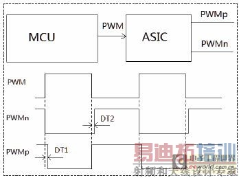 互补式的PWM的结构框图与时序图如图2所示,由通用MCU产生PWM输出,输入ASIC,经延时时间插入电路,产生互补式的PWM输出,此PWM输出为PWMp,PWMn两路,PWMp控制P-MOS,PWMn控制N-MOS。这两个MOS管在充电时,用于控制充电电流;在放电时可用于控制放电电压。充电时,PMOS导通的时间越长,充电功率越大。放电时,NMOS导通的时间越长,放电功率越大。