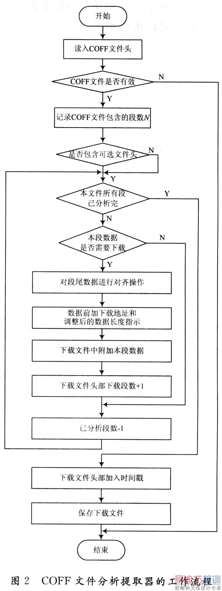 首先读入目标文件,该文件扩展名为out,以二进制形式读入。分析.out文件的文件头以确定有多少个段,然后逐段分析段信息头,根据段属性标识以确定是否需要下载,段头中的绝对地址、段数据长度等信息作为升级文件的一部分。与需下载的段数据合并成最终的下载文件,为了适应自动化升级的需要,下载文件头部还保留了COFF文件的时戳。值得注意的是因为TMS320C6000 DSP为32位处理器,需要对段落头中段数据长度信息进行32位整型对齐,在此采用Ceil对齐——不足的字节以O补齐。具体流程如图2所示。