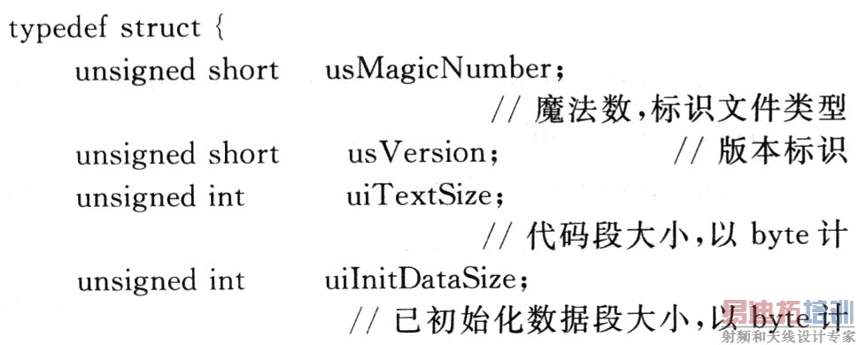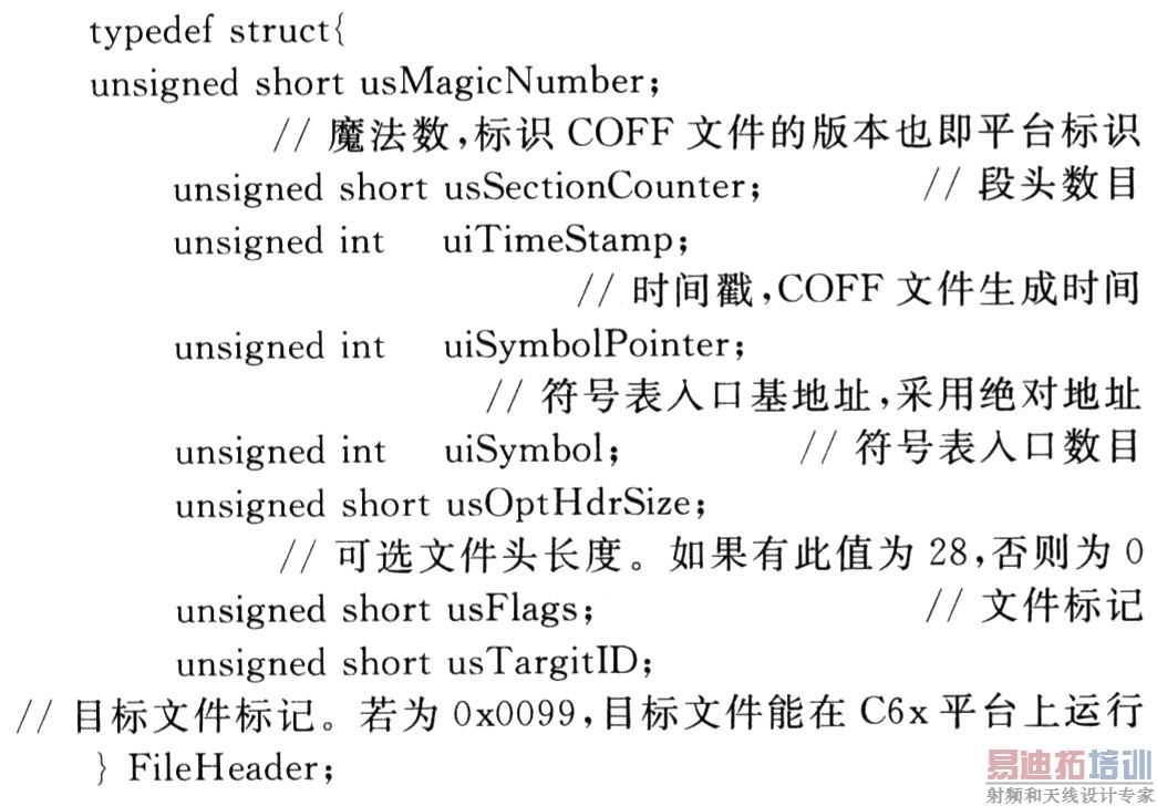 (2)可选头:可选头接在文件头的后面,也就是从COFF文件的Ox0014偏移处开始。长度可以为O。不同平台的可选头,长度和结构都不相同,TI DSP采用的可选头长度为28 B,用C的结构描述如下: