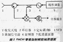 射频收发前端是雷达系统的核心部件。国内外已经对前端进行了大量深入研究,并取得了长足的进展。已经研制出各种结构的前端,主要包括波导结构前端,微带结构前端以及前端的单片集成。国内研制的射频前端主要是波导结构前端。一个典型的射频前端主要包括线性VCO、环行器和平衡混频器三部分,如图2所示。前端混频输出的中频信号经过中频放大送至后级数据处理部分。数据处理部分的基本目标是消除不必要信号(如杂波)和干扰信号,并对经过中频放大的混频信号进行处理,从信号频谱中提取目标距离和速度等信息。