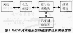 FMCW汽车雷达系统如图1所示,包括天线、收发模块、信号处理模块和报警模块或汽车制动装置。