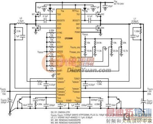 图 1:采用外部功率 MOSFET 的双输出稳压器发软件,极大地简化了复杂的多轨系统设计,该开发软件是一种基于 PC 的全面开发环境 (参见图 6)。在该环境中,在线测试 (ICT) 和电路板调试仅需要点击几下鼠标就可完成,而无需焊接到“白色导线”定位点中。由于可以使用实时遥测数据,所以可以立即得到设计结果,从而有可能预测电源系统故障,并立即采取预防性措施。