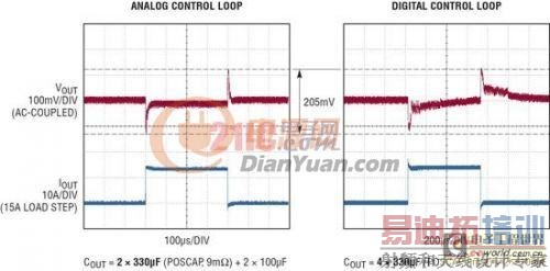 图 3:在 15A 瞬态负载步进情况下,模拟和数字控制环路响应的比较。模拟控制环路需要的输出电容仅为数字环路的一半,同时实现了卓越得多的稳定时间