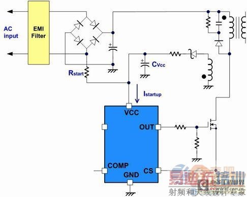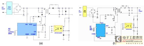 图1所示为典型返驰式PWM IC的应用线路,其中,图1a是使用高压启动的PWM IC;图1b则是使用低压启动的PWM IC。