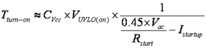 其中,VUVLO(on)为Vcc的启动电压触发点;Vac为输入的交流电压;Istartup系IC Vcc的启动电流。而Cvcc则是Vcc接脚上的电容器容量;Rstart为启动电阻。