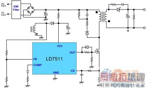若针对市场应用来看,现在有很多小型充电器(Charger)或发光二极体(LED)照明产品,由于空间上的限制,常会使用一次侧电压回授稳压技术,如图8所示为通嘉LD7511一次侧电压回授稳压线路图,该架构最主要的好处是可以省掉光耦合器与二次侧TL431的相关元件,大幅简化整个电源线路,藉以节省设计空间及成本。