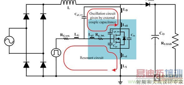 图2.包含功率MOSFET内外部寄生元件的PFC电路简图