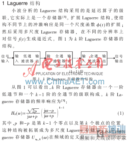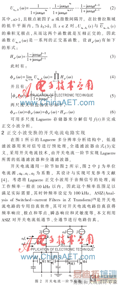小波变换可以在多尺度上对信号进行分解,并同时在时域和频域上具有较好的局部化特性。这种优异的时频分析特性使得小波变换成为分析非平稳和瞬变信号的强有力工具,在信号检测、特征提取、语音分析、图像处理、模式识别、故障诊断和定位、数据压缩等领域取得了良好的应用[1]。开关电流电路是基于电流模的电路,它用离散时间的取样数据系统处理连续时间的模拟信号,具高频特性好、低电压、低功耗、动态范围大等优点[2]。在利用小波变换对信号进行处理时,为了保证原始信号域和变换域分析的一致性,往往需要按某种方式可以完全重建信号的小波变换,最完美的一种解决方案就是正交小波变换。如果小波函数是正交的,则信号重构可以用多分辨分析理论来进行,否则必须用小波级数与小波框架理论来进行信号重构[1]。本文对Laguerre结构进行研究,根据正交小波变换的Laguerre结构实现方案,提出正交小波变换的开关电流电路实现,便于其被制成符合最新数字工艺的集成芯片。