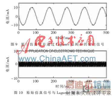 对Laguerre结构实现正交小波变换进行仿真。在完成低通节和全通节电路实现与仿真的基础上,用Matlab对其进行系统级仿真。原始仿真信号为复合正弦信号,由一个频率为10 Hz的正弦波(低频成分,其电流幅值设定为10 mA)和一个频率为1 kHz的正弦波(高频成分,其电流幅值设定为2 mA)构成。用Laguerre结构对该复合试验正弦信号进行正交小波分析,得到的仿真结果如图8~图10所示。图8为原始仿真信号;图9为原始仿真信号通过Laguerre结构后的输出信号,这时信号仅剩下原始仿真信号的低频成分,得到了原始仿真信号的概貌逼近;图10为原始仿真信号与通过Laguerre结构后的信号的差值,其频率较高,是原始仿真信号的高频成分,也即是原始仿真信号的细节逼近。
