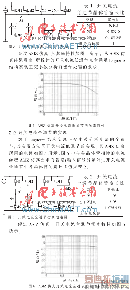 对于低通节,采用图2所示结构,其ASIZ仿真所用的电路如图3所示。图3中与各晶体管相接的电流源应ASIZ仿真要求而省略(输入信号源除外)。开关电流低通节中各晶体管的宽长比值见表1。