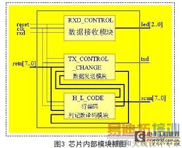 reset复位输入端;clk时钟输入端;rxd串行数据接收端;retn0-retn7键盘扫描行输入线;txd串行数据发送端;scan0-scan7键盘扫描列输出线;led0-led2显示输出端。