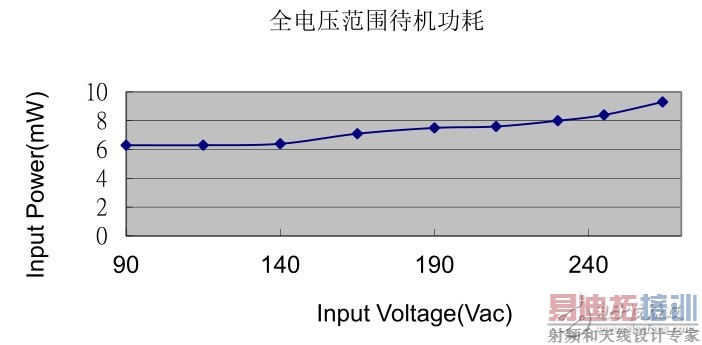 图中可以看出,变换器在全电压范围内,待机功耗低于 10mW。