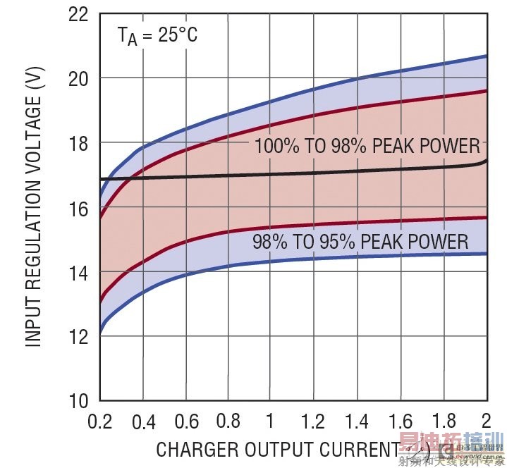 [p]足的情况,将通过输入调节环路减小充电电流以维持 17V 的 VMP 太阳能电池板电压。倘若充电电流减小至 200mA 以下,则充电器开始执行 PWM 操作且调节门限降低以执行浮动充电,就像在前面提到的铅酸电池充电器电路中一样。此外,该充电器还把VIN(REG) 降低至 15V,从而跟踪低电流条件下太阳能电池板 VMP 的下降。