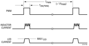 LT3754的PWM调光能力高达3000:1。图2显示了这种3000:1 PWM调光的波形和一个LED电流方波波形。甚至在仅3.3μs的接通时间内,20mA的LED电流也与100Hz PWM信号同步接通和断开。更高的PWM调光比可用更低的PWM频率实现,不过100Hz保证没有可见闪烁。