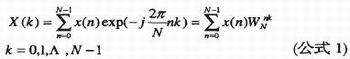 首先初始化McBSP0口和McBSP1口,配置AIC23,然后启动AIC23的A/D转换,将由麦克风输入的模拟音频信号进行采样,然后对采样到的音频信号进行傅立叶变换,总体流程框图如图4所示。离散傅立叶变换(DFT)的公式见公式1,为了进行快速傅立叶变化,采取时间抽取(DIT)基2FFT算法。