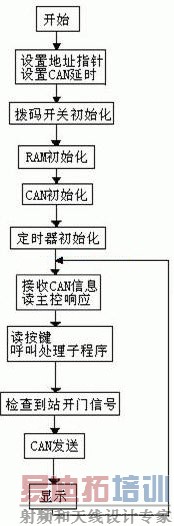 软件要实现拨码开关的初始化设置、 CAN的初始化设置、读主控响应并接收从CAN总线传来的信息、处理按键呼叫子程序、CAN发送以及点阵显示。程序主流程图如图3所示。