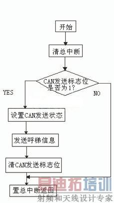 当发送呼梯信息时,CAN的16位设置CAN发送的格式、数据桢和位数据;17位存放楼层号作为ID号;18位设为0;19和20位存放上行信息,有上行信息就发送2个字节FFFFH,如果没有就发送0000H;21和22 位存放下行信息。CAN模块发送数据流程图如图2所示。