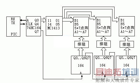 呼梯控制器显示单元包括按键灯、楼层、方向箭头和检修灯的显示。传统的电梯都是用七段码来显示方向箭头和楼层数,本系统采用5×7的LED点阵显示屏来显示,并且可以让箭头和楼层数在电梯运行的时候进行滚动显示。PIC通过TX口发送4个8位串行信号,发送顺序依次为箭头方向,十位楼层,个位楼层和行选中。将上一个串行转并行器件74HC164的并行输出端Q7与下一个74HC164的串行输入端A相连,构成4个74HC164的级连,最先发送的箭头方向信号就被传送到最后一个74HC164上,后3个74HC164的输出端Q0~Q6分别连接3个点阵的列地址A1~A7,第一个74HC164的 Q0~Q4通过单向驱动器件MC1413连接3个点阵的行地址B1~B5。点阵采用扫描的方式,软件中每隔1ms输出一行,因此5行只需要5ms的时间, 人眼不会感到闪烁;列信号每隔50ms移一位,因此可以产生箭头和楼层数的滚动效果。当电梯出现故障时,单片机通过I/O口输出高电平来点亮检修灯。点阵显示原理图如图1所示。