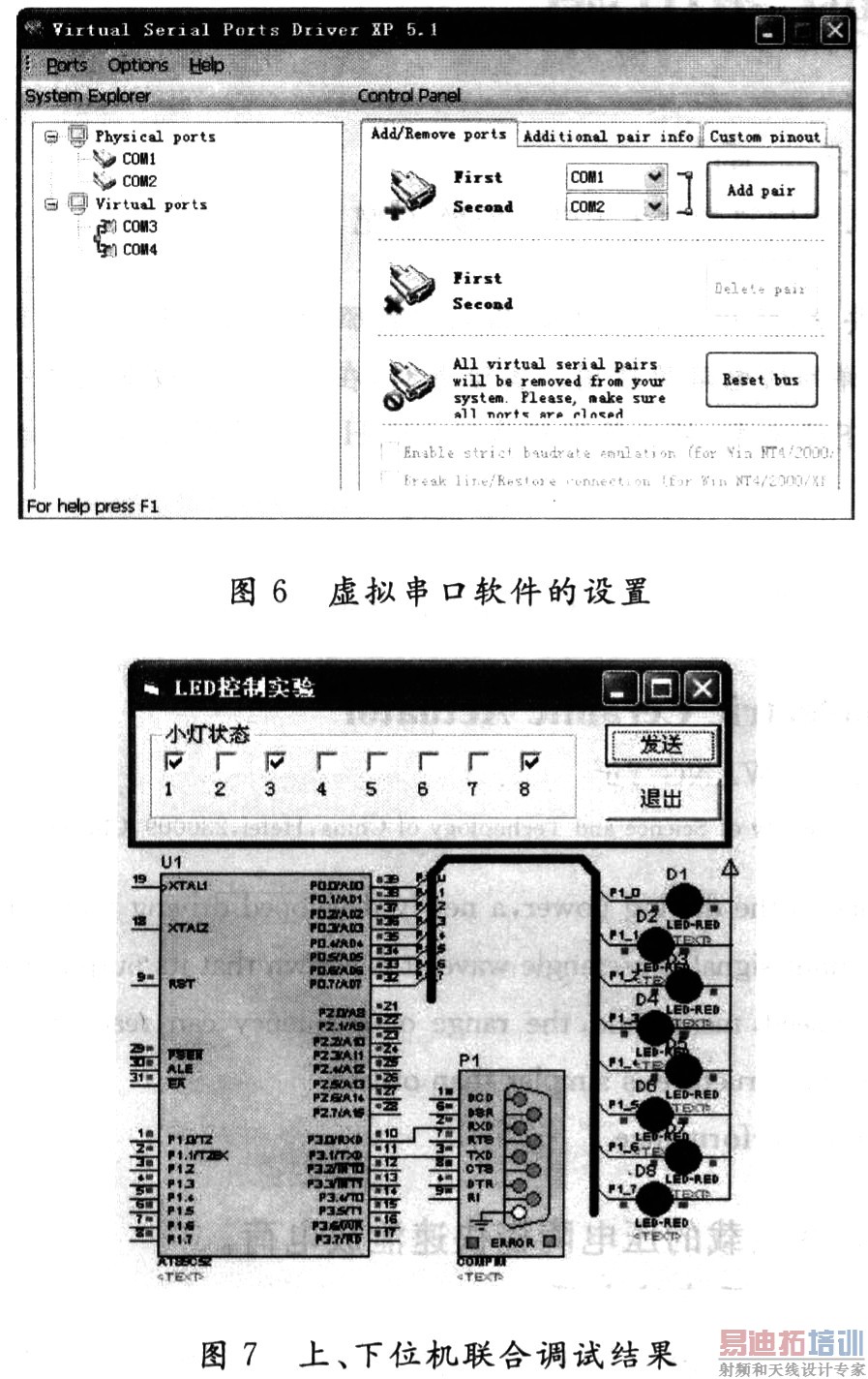 PC上位机与下位机的联系,传统上是通过物理接口如串并口等完成。虚拟实验室中,由于下位机在PC中用软件模拟实现,上位机与下位机的联系与传统有所区别。这里使用虚拟串口软件Virtual Serial Ports Driver XP 5.1,其目的是用软件虚拟出VB上位机和Proteus中建立的单片机系统完成通信的串口。值得注意的是,这种通信只能在两个虚拟串口之间进行,该例子中,上位机和单片机系统各使用一个虚拟串口,从而实现通信。