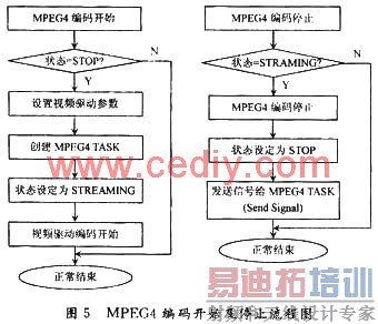 MPEG4编码停止的主要作用是停止视频解码芯片、视频编码芯片工作,停止MPEG4 TASK。MPEG4编码开始及停止流程图如图5所示。