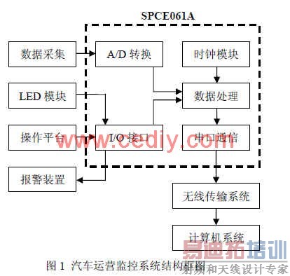 汽车运营监控系统是基于 SPCE061A实现的。其主要功能为:现场数据经变送器转换为标准的电压模拟量信号;单片机采集该模拟量信号并进行 A/D转换;处理、存储 A/D 转换后的数据;LED显示;软件实现时钟功能;通过 RS232 串口与本端的数传电台连接,发送数据给计算机系统以及声光报警等。