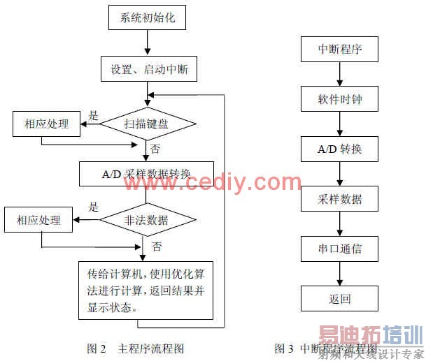 计算机系统中的软件部分主要是应用优化策略的算法,如遗传算法等。为了提高系统的实时性效果,主程序分担了更多的任务,如数据处理、 LED显示、报警等。主程序和中断程序流程图如图 2和图 3所示。