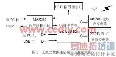 无线式数据通信接口卡原理框图如图1所示。接口卡以一块EZ-USB FX单片机为中心,单片机通过RS-232或USB接口接收来自计算机的命令和数据,然后经nRF903调制后发送出去,返回的数据经无线收发电路解调后,EZ-USB FX单片机可进行正确的读取,然后通过RS-232或USB接口传送给计算机进行处理。整个工作过程由X5043看门狗电路进行监控。LED信号指示灯用于指示接口卡的工作状态。