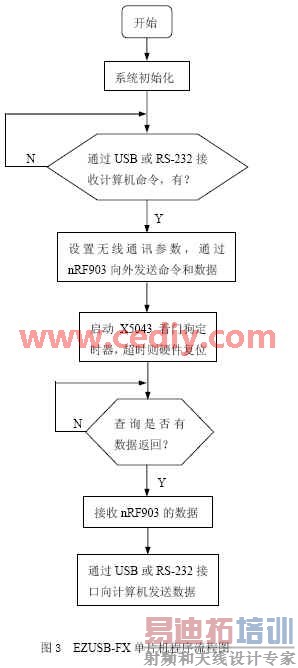 EZ-USB FX单片机软件主要包括系统初始化、看门狗监控程序、与计算机通讯和读写nRF903数据程序等4个部分。