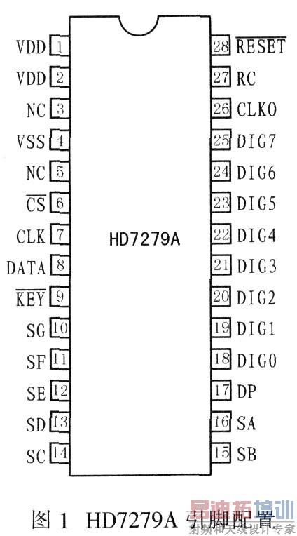 HD7279A最显著的优点是与单片机的接口简单,最多只需5条连接线,分别是复位端RESET,片选输入端CS,同步时钟输入端CLK,数据输入输出端DATA和按键有效输出端KEY。在一般应用系统中,RESET可直接接电源,当应用系统中只有一片HD7279A器件时,CS也可以直接接地,此时只需占用3条单片机的I/O端口线,如果应用系统中没有键盘,仅具有显示功能,或者即使有键盘,但单片机软件任务不复杂,均可不接KEY线,使用定时读取键盘键值代码的方法,则此时只需占用2条单片机的I/0端口线。
