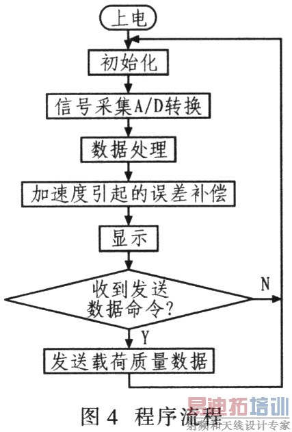 系统程序流程主要是对采集到的数据进行误差分析处理。图4为车辆称重数据处理程序流程.其中初始化DSP、AD7891和外围元件,包括设置堆栈指针,设置定时器工作模式并使其能中断,设置数据存储器初值及对A/D转换器初始化等。系统上电后,首先执行初始化程序。初始化完成后.调用信号采集和A/D转换程序,分别采集前、后轮轴的电容传感器输出信号和车辆加速度传感器输出信号。