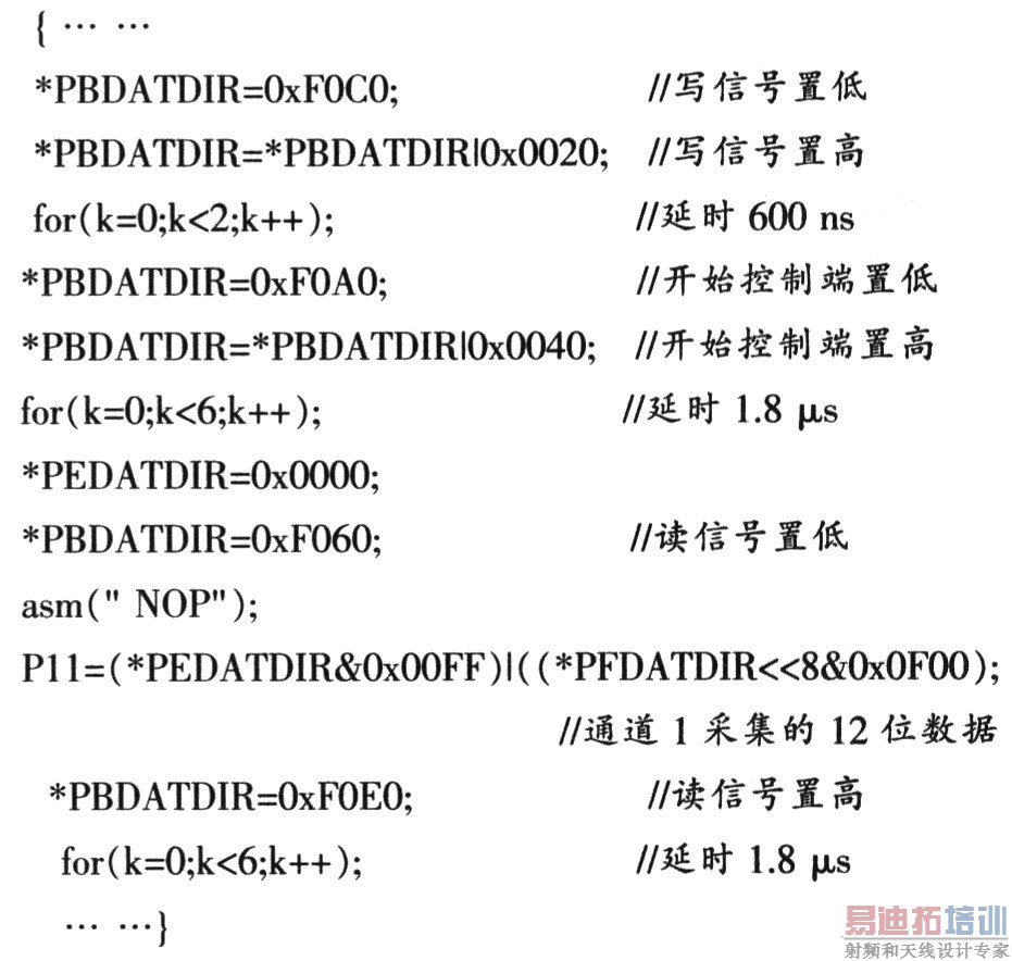 图5中,t1为从CS到RD/WR的触发时间,t2为写脉冲宽度,不小于35 ns;t3为写有效数据时间,不小于25 ns;t4为有效数据保持时间,不小于5 ns;t5为CS到RD/WR的保持时间,t6为CONVST脉冲宽度时间,不小于35 ns;t7为EOC脉冲宽度时间,不小于55 ns;t8为度脉冲宽度,不小于35 ns;t9为RD下降沿之后读数据时间,不小于25 ns;tCONV为转换时间,不大于1.6μs。为实现测控系统的高速实时采样必须合理准确分配以上各时间,AD7891的工作时序全部由DSP的I/O端口实现。系统DSP主频时钟为30 MHz,采用分频15 MHz输出,单周期指令运行的时间为33 ns。用C语言执行一个I/O端口指令,编译完后,大概需要4个周期指令时间。下面是测控系统DSP对通道1采集的C语言程序代码: