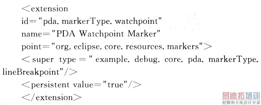 断点属性保存在标记中,平台提供接口IMarker,作为文件中的一般目的标记。标记是原始数据类型键值对的存储。平台提供接口IBreakpoint实现断点行为。为了实现复杂的断点行为,调试器需要提供IBreakpoint的实现。所有的断点都有一个相关的标记保存属性和在编辑器中显示,提供和断点类型相关的标记扩展点。如果需要断点被保存,需要指定persistent为true。其内容如下: