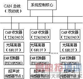 机器人系统控制核心由ARM或DSP实现。其主要功能是处理需要复杂计算的信息,将经过处理的信息再送回CAN总线,并对整个网络进行管理。超声波智能节点控制系统的主要功能就是判断障碍物位置,将对移动机器人前进方向有阻碍的障碍物信息通过CAN总线传回主控系统,由主控系统作出相应处理并进行避障动作。本文将着重介绍超声波智能节点控制系统。