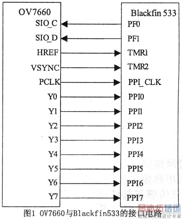 0V7660图像传感器,内置自动曝光控制(AEC)、自动增益控制(AGC)、自动白平衡(AWB)等功能,支持SXGA、VGA、QVGA、QQVGA、CIF、QCIF和QQCIF,可输出RGB、YUV和YCbCr等多种视频数据格式。0V7660通过一个专用的Camera Interface接口与核心处理芯片BF533的PPI接口连接,接口电路如图1所示。