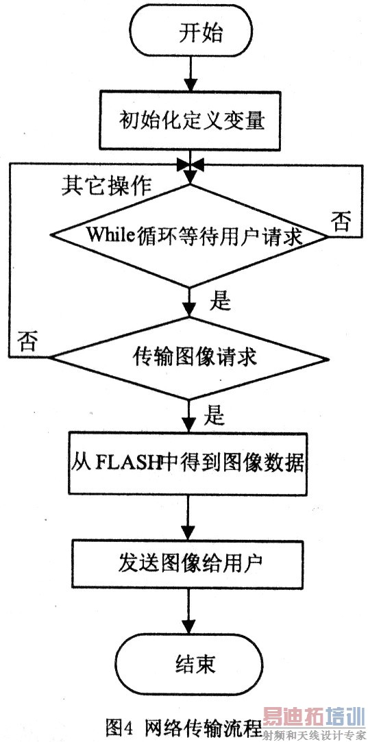 在uClinux平台上采用服务器/客户端模型通过建立TCP套接字来实现网络的连接,本系统通过基于TCP协议的socket编程,完成了图像数据的发送和客户端的接收程序。流程图如图4所示。