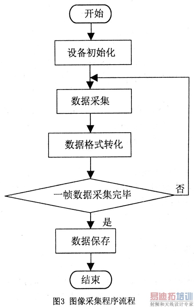 本系统的应用软件设计分为图像采集设备初始化、数据格式转化和图像的捕捉三部分。视频图像采集的程序流程图如图3。