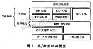 TI公司提出了基于DSP/BIOS的设备驱动模型,该模型分为两层:类驱动即与硬件不相关的层和微型驱动即与硬件相关的层。使用这种结构,应用程序只需调用类驱动的API函数,通过类驱动使用微型驱动,用微型驱动来控制外设。这种结构,将驱动程序合理分层,使得驱动程序模块化,可移植性、复用性大大增强,缩短了驱动程序的开发时间。