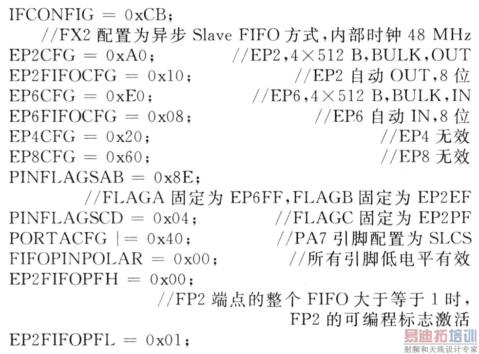FX2芯片在使用时必须先下载固件程序,固件程序主要负责完成芯片初始化,对芯片进行必要的配置、处理设备请求、进行数据传输等相应工作。用户通过编写适当的固件程序完成对FX2的设置。Cypress公司提供了一个固件程序开发框架可以大大简化FX2芯片固件程序的开发难度。通过编写用户初始化函数TD_Init(),用户可以规定各种端点资源的使用以及配置外围接口的输入/输出等。其主要配置语句如下:
