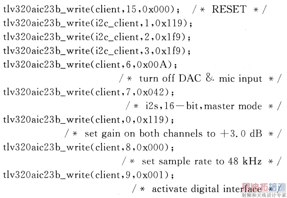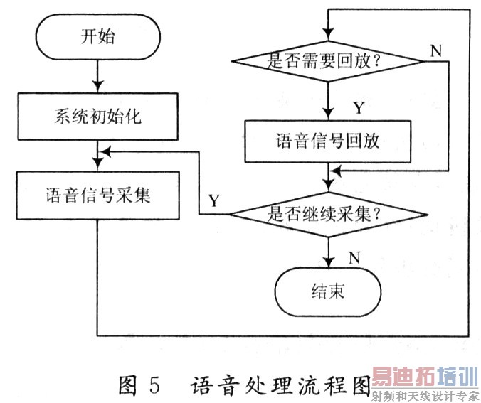 系统的语音处理程序流程图如图5所示,软件设计实现语音的采集和回放,系统的软件设计采用C语言和NiosⅡ汇编语言混合编写。为使AIC23正常工作并产生预期效果,必须对其相应的寄存器进行配置。这里只列出对AIC23芯片初始化设置时的部分代码,AIC23是通过I2C总线进行初始化配置的。