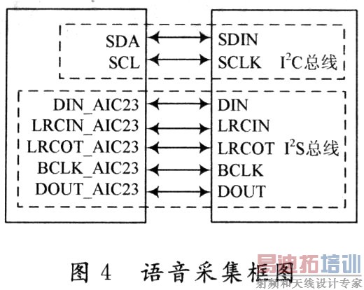 AIC23芯片与EP2C35系列FPGA的连接电路如图4所示。通过I2C控制接口配置AIC23的11个寄存器;通过I2S总线读写音频数据,读写音频数据使用DMA方式。