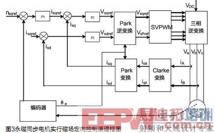 该控制器的主体核心采用TMS320F2406 DSP(U4)进行程序编程,以实现对永磁同步电机实行磁场定向控制。对永磁同步电机实行磁场定向控制的原理框图如图3。