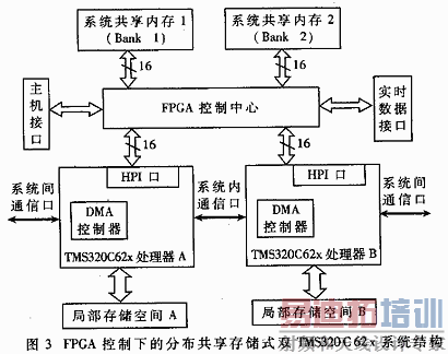为了尽可能地获得高性能,我们提出以两个TMS320C62x为中央处理核心构成双DSP处理系统,由FPGA(这里采用ALTERA的FLEX系列)实现系统互连。系统分为处理器模块、FPGS组模块和各总线接口模块等,如图2所示。其中处理器模块包含TMS320C62x、内存空间以及相应逻辑。处理器作为最小处理单元模块而存在,可以完成相应的处理子任务。在我们的系统中设备了两个这样的处理子任务。在两个处理模块都是在系统核心FPGA控制下运行的。而FPGA作为系统中心,负责两个微处理器互相通信、互相协调以及它们与外界(这里通过主从总线和互连总线)的信息交换。同时,系统处理子任务可以由FPGA直接派发给处理器。灵活的FPGA体系结构设计是该系统有效性的保证。在实际应用中,可以根据系统的任务,通过配置FPGA控制两个微处理器按流水线方式运行,也可以控制它们按MIMD方式并行处理同一输入图像。为了提高数据交换的效率,在FPGA控制下的数据交换中心设置了灵活的系统存储空间。而这块存储空间与DSP的局部存储空间构成了一种分布共享式的结构。然而不同于一般的分布共享式存储结构的,我们的系统存储空间相对独立,不是直接挂接在各DSP的地址空间中,而是通过两者的HPI口进行互连。从严格意义上讲,这种结构不能算分布共享式存储结构,而应称之为一种松散的分布共享式存储结构。由于并行效率要求,我们将系统存储空间设置为两个Bank结构,两个Bank是独立控制和运行的,系统的实际框图见图3。