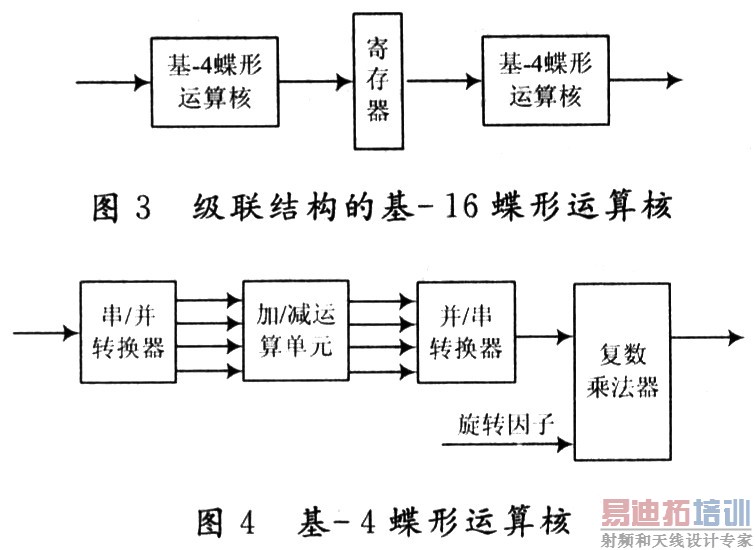 采用并行流水结构实现的基-16运算核,一个数据时钟可处理16个数据。而每次蝶形运算在一个数据时钟内只需要计算出一个结果,这将造成资源浪费。因此,采用级联结构实现的基-16蝶形运算核,用两个基-4蝶形运算核分别复用4次来实现每一级中的四个蝶行运算,中间用一个串行出入/输出的寄存器进行连接,其结构框图如图3所示。