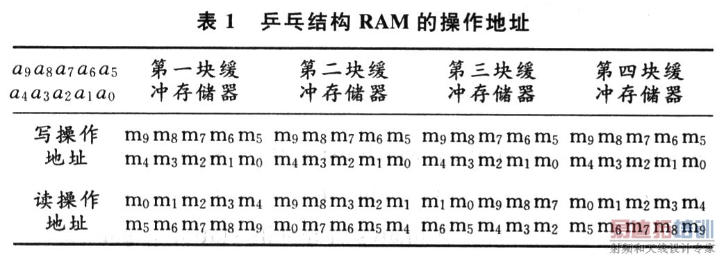 传统的级联结构的FFT处理器的缓冲存储器都是采用乒乓结构,基本思想就是用两块相同的RAM交替读出或写入数据。即其中一块RAM在写入数据时,另一块RAM用于读出数据。当用于写入数据的RAM写满时交换读写功能。将乒乓结构中RAM的内部存储单元地址用二进制数a9a8a7a6a5a4a3a2a1a0表示。以写满其中以块RAM为一个周期,用一个二进制计数器m9m8m7m6m5m4m3m2m1m0生成的顺序写入,混序读取的乒乓结构RAM的操作地址如表1所示。