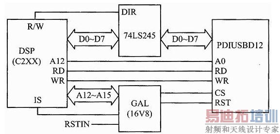 对于基于DSP平台的USB接口设计,经过综合考虑了几种方案之后决定,采用一个不带MCU内核的USB接口芯片PDIUSBD12(成本非常低,一片PDIUSBD12的价格仅为20元),再加上简单的外围电路和时序调整电路。