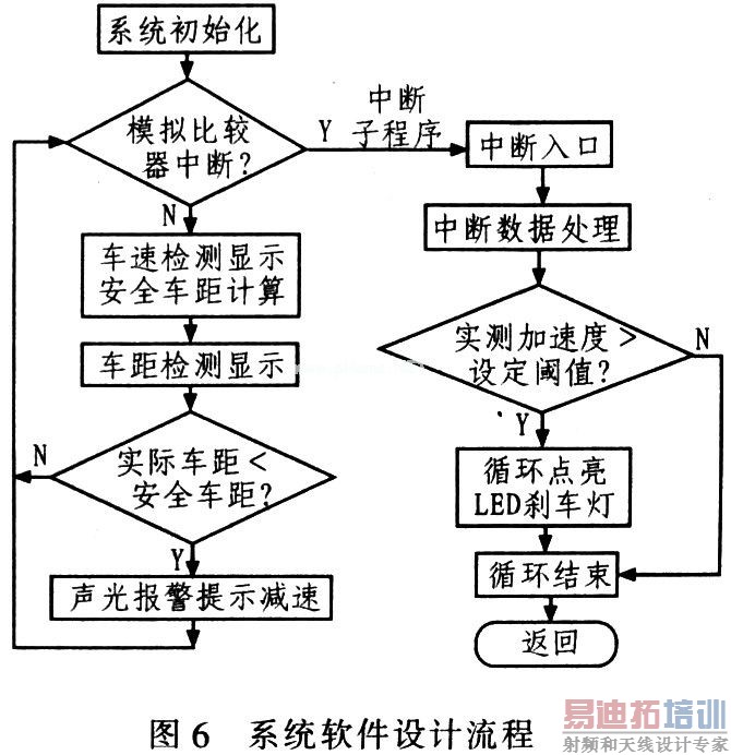 控制部分由ATmega8L控制完成,主要功能为:计算本车速度、车间距离,测定加速度,并通过LCD实时显示;实际车间距离和安全车间距离的比较发出报警声或报警灯闪烁;刹车时的加速度与设定阈值相比,决定是否点亮LED刹车灯,系统软件设计流程如图6所示。