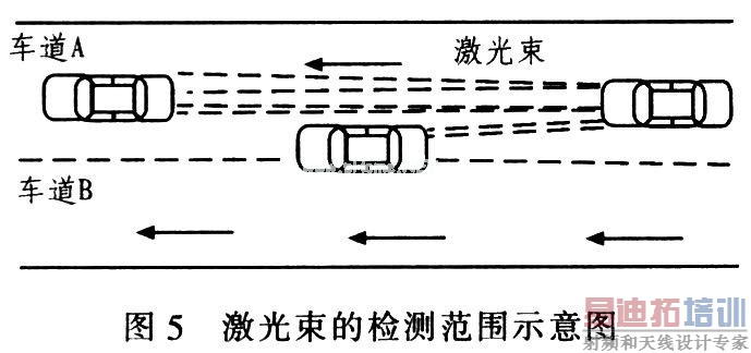 该部分电路由发光部、受光部、信号调理电路等组成,最终输出信号由系统单片机处理。由于激光雷达发射光束集中,采用单一发射方式无法有效检测前方一定距离,故在汽车前方安装3个激光雷达测距模块,如果其中一个模块检测到的距离小于该时刻最小允许距离,安全装置将报警,即能够及时检测到插入车流的车辆并警报,如图5所示。