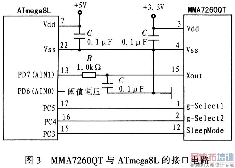 MMA7260QT加速度传感器采集汽车加速度数据,并将数据通过ATmega8L的PD7(AIN1)端口传输至ATmega8L,其具体连接电路如图3所示。